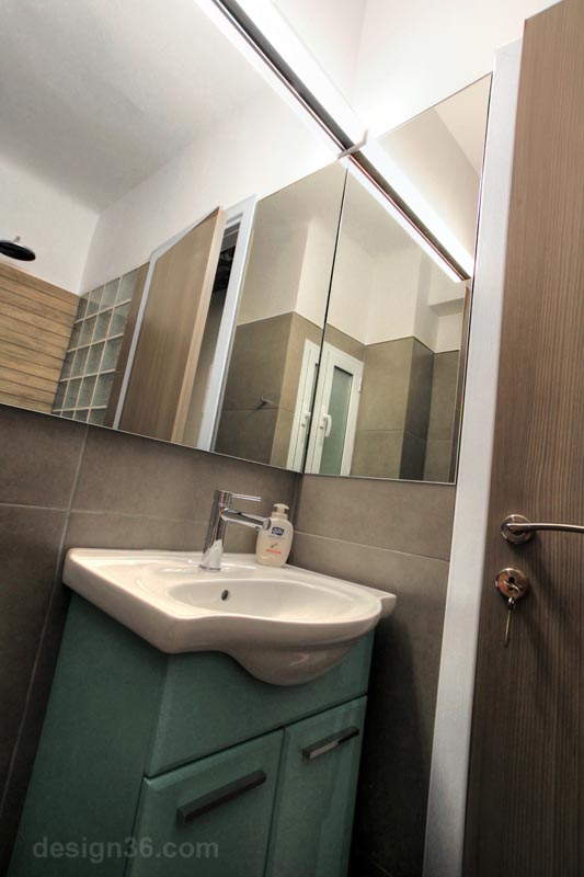 Στη συγκεκριμένη μελέτη δημιουργήσαμε ένα mini studio για βραχυπρόθεσμη ενοικίαση. Χρησιμοποιώντας την εμπειρία μας στον σχεδιασμό ξενοδοχείων, αντιμετωπίσαμε το διαμέρισμα περισσότερο σαν μια σουίτα. Ο ενιαίος χώρος του καθιστικού - υπνοδωματίου χωρίζεται στα δυο από τον κύβο που προκύπτει από τον χώρο του μπάνιου. Για να αναδείξουμε τον κύβο σε ένα γεωμετρικό παιχνίδι τον επενδύσαμε με ταπετσαρία ενώ για να οδηγήσουμε φυσικό φως στο μπάνιο και να διατηρήσουμε την αίσθηση του ενιαίου χώρου, κατασκευάσαμε τον τοίχο της ντουσιέρας από υαλότουβλα.